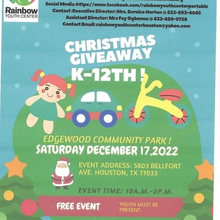 Christmas Giveaway for K-12 December 17,2022 @ Edgewood Community Park Center @ 5803 Bellfort Ave Houston Texas 77033.