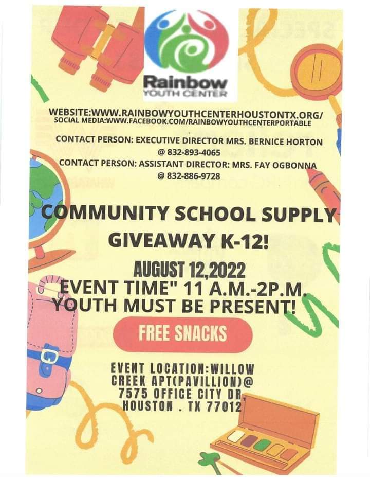 Our Community School Supply Giveaway K-12 at Willow Creek Apt Pavilion outside on August 12,2022 was a success. We served over 800 youth on that day Special thanks to all of our sponsors and volunteers. Executive Director Mrs Bernice Horton , Assistant Director Mrs Fay Ogbonna. August 28, 2022 rainbowyouthcenterhoustontx.org
